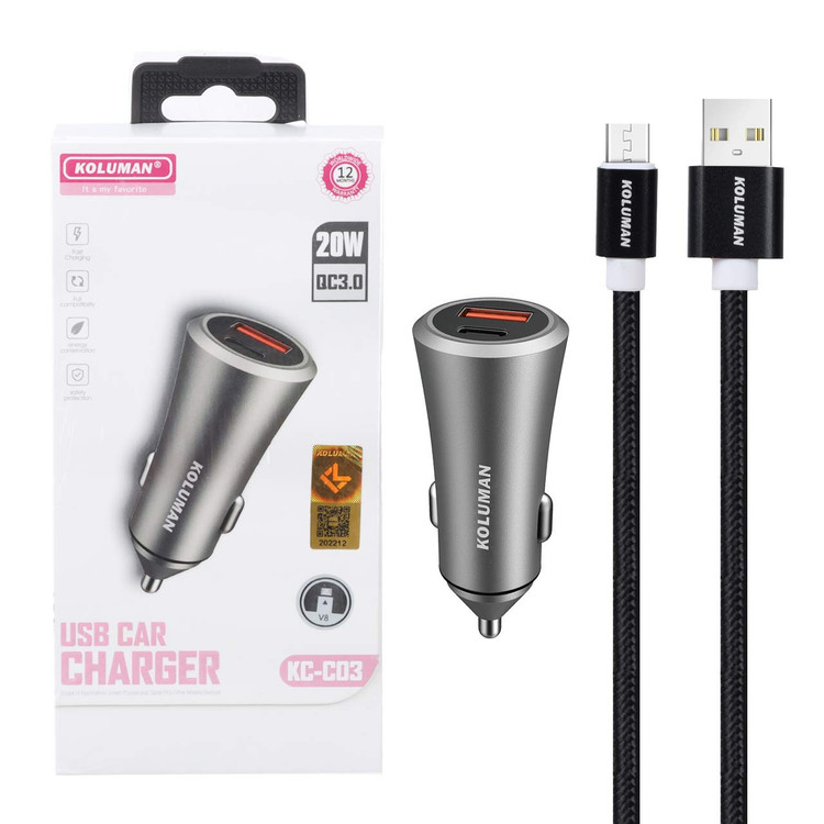 شارژر فندکی فست دو پورت Koluman مدل KC-C03 20W همراه با کابل اندروید - خاکستری (گارانتی یکساله PMC)